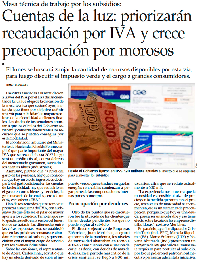 Cuentas de luz: mesa técnica revisará el lunes cifras de recaudación por IVA y pide mejoras en postulación a subsidio - (Diario Financiero)