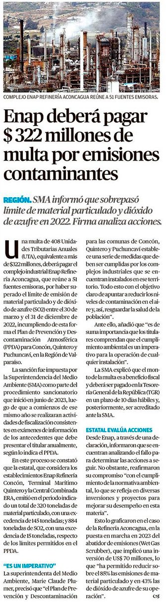 Multan a Enap por incumplimiento, tras superar límites de emisiones en la Región de Valparaíso - (El Mercurio de Santiago)