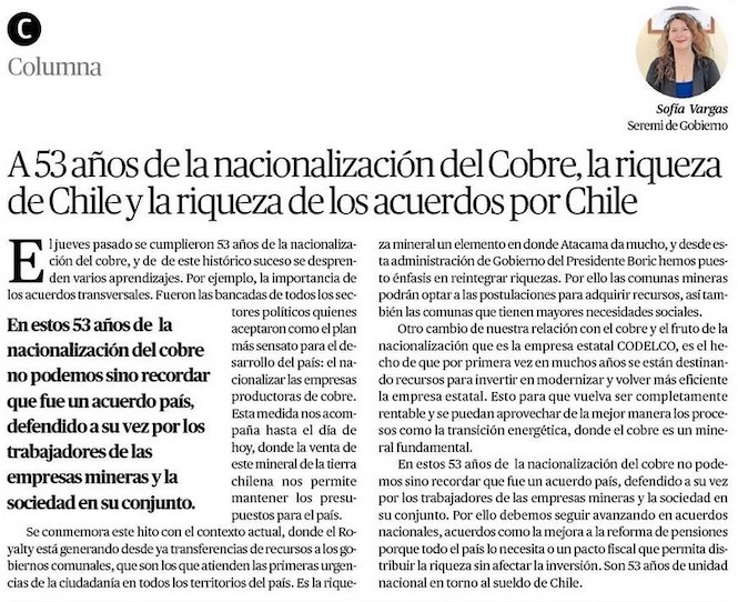 A 53 años de la nacionalización del Cobre, la riqueza de Chile y la riqueza de los acuerdos por Chile - (El Chañarcillo)