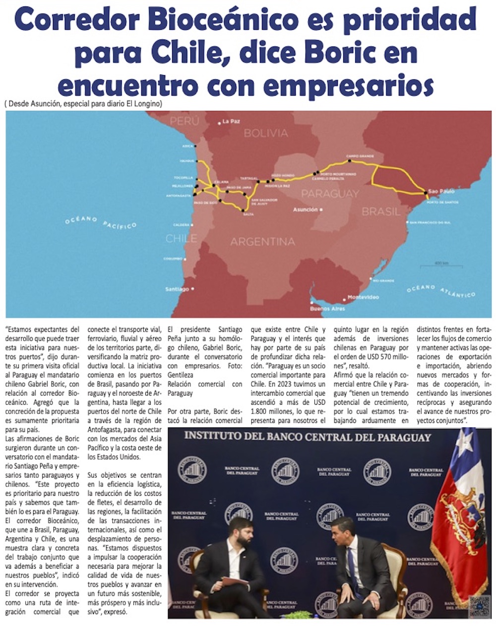 Gobierno compromete comisión de “alto nivel” para impulsar Corredor Bioceánico que une cuatro países - (El Mercurio de Santiago)