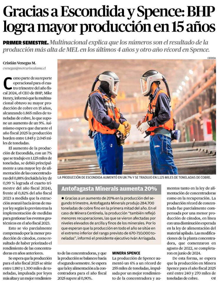 Gracias a Escondida y Spence: BHP logra mayor producción en 15 años - (El Mercurio de Calama)
