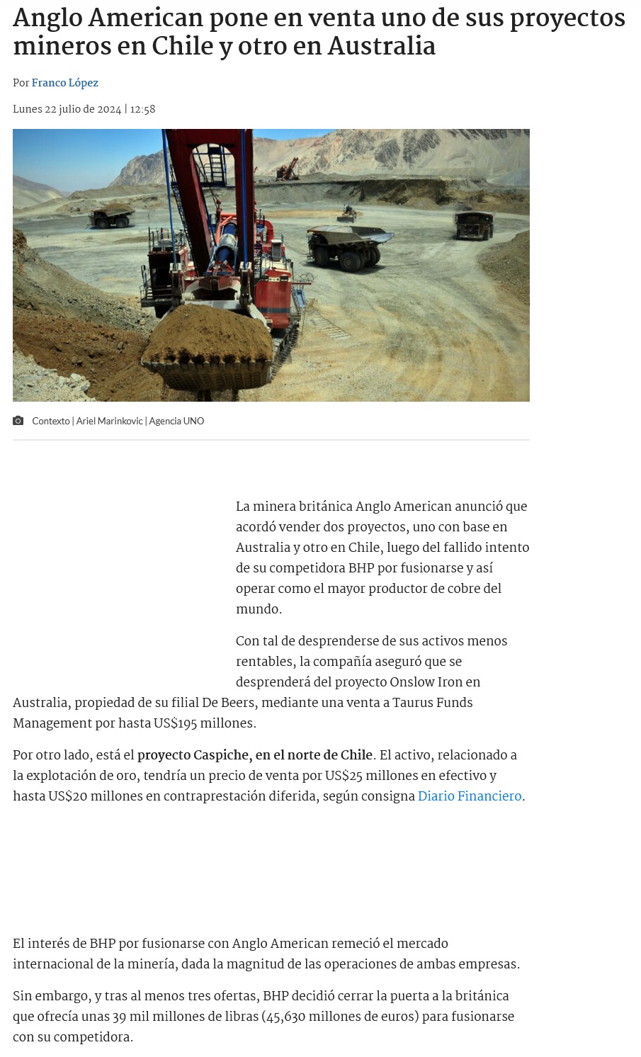 Anglo American vende sus proyectos mineros Caspiche, en Chile, y Onslow Iron, en Australia - (DF Online)