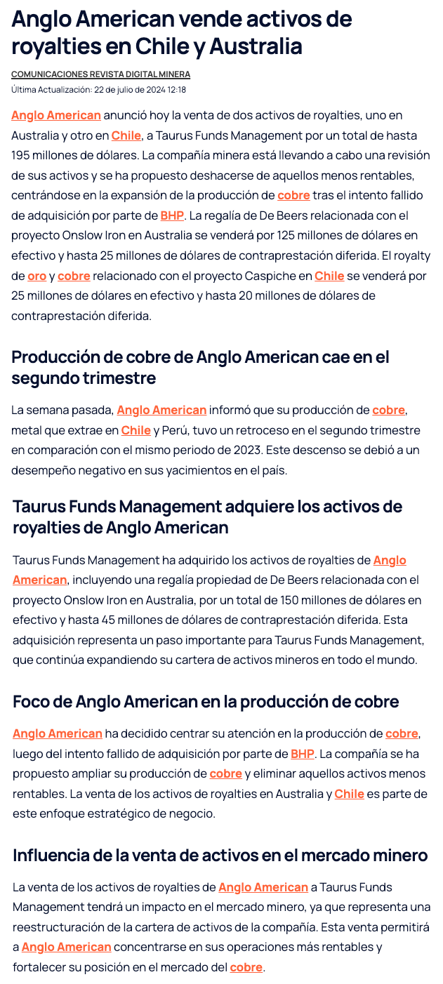 Minera Anglo American acuerda vender proyectos en Chile y Australia por hasta US$ 195 millones - (americaeconomia online)