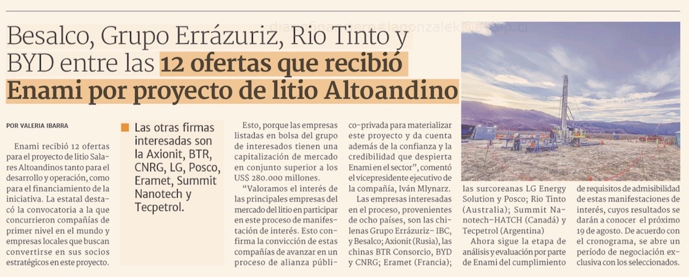 Litio: BYD, Rio Tinto y Besalco están interesados en asociarse con Enami - (El Mercurio de Santiago)