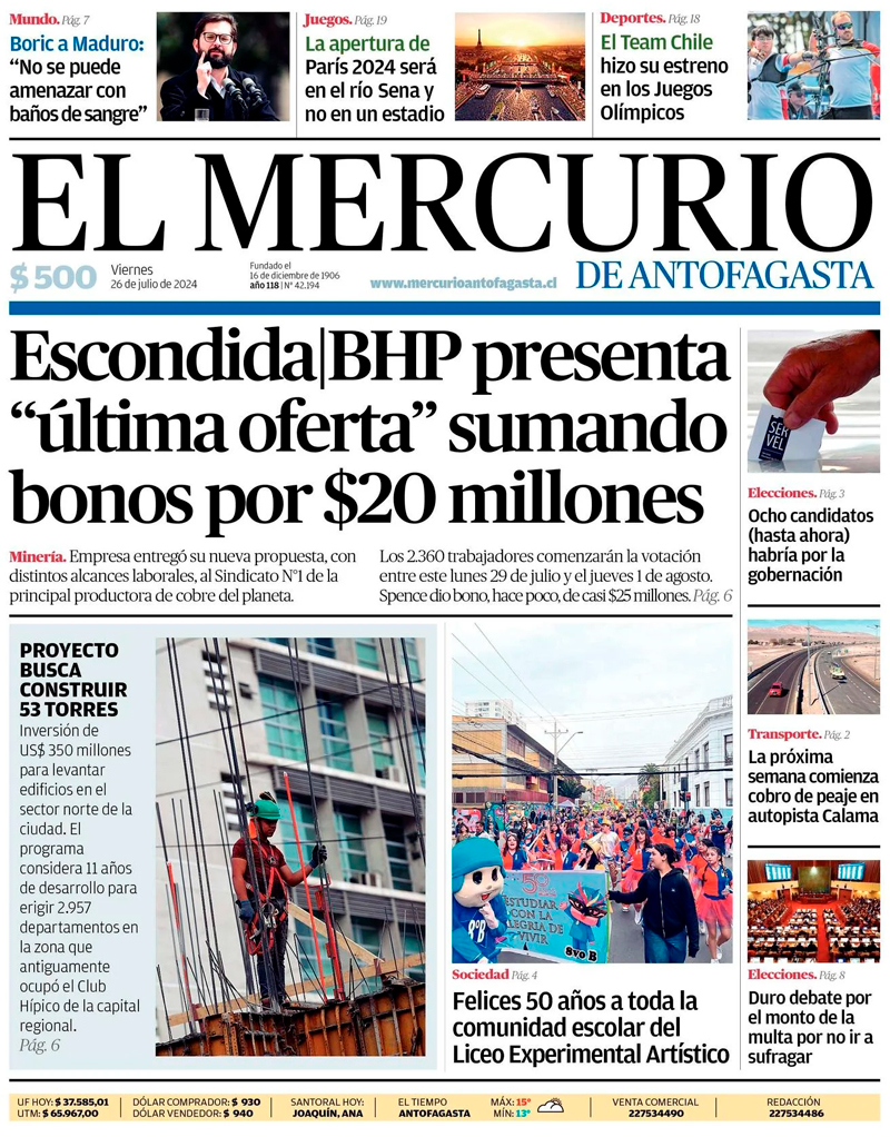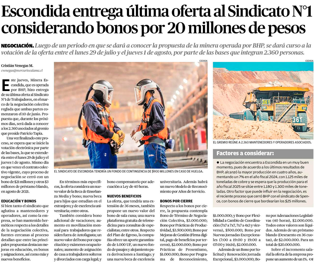 Escondida entrega última oferta al Sindicato N°1 considerando bonos por 20 millones de pesos - (El Mercurio de Calama)