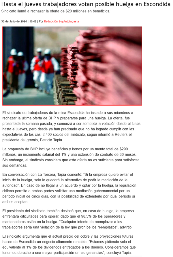 Trabajadores de Minera Escondida se Preparan para Huelga: Sindicato Rechaza Oferta de BHP - (mineriaenlinea.com)