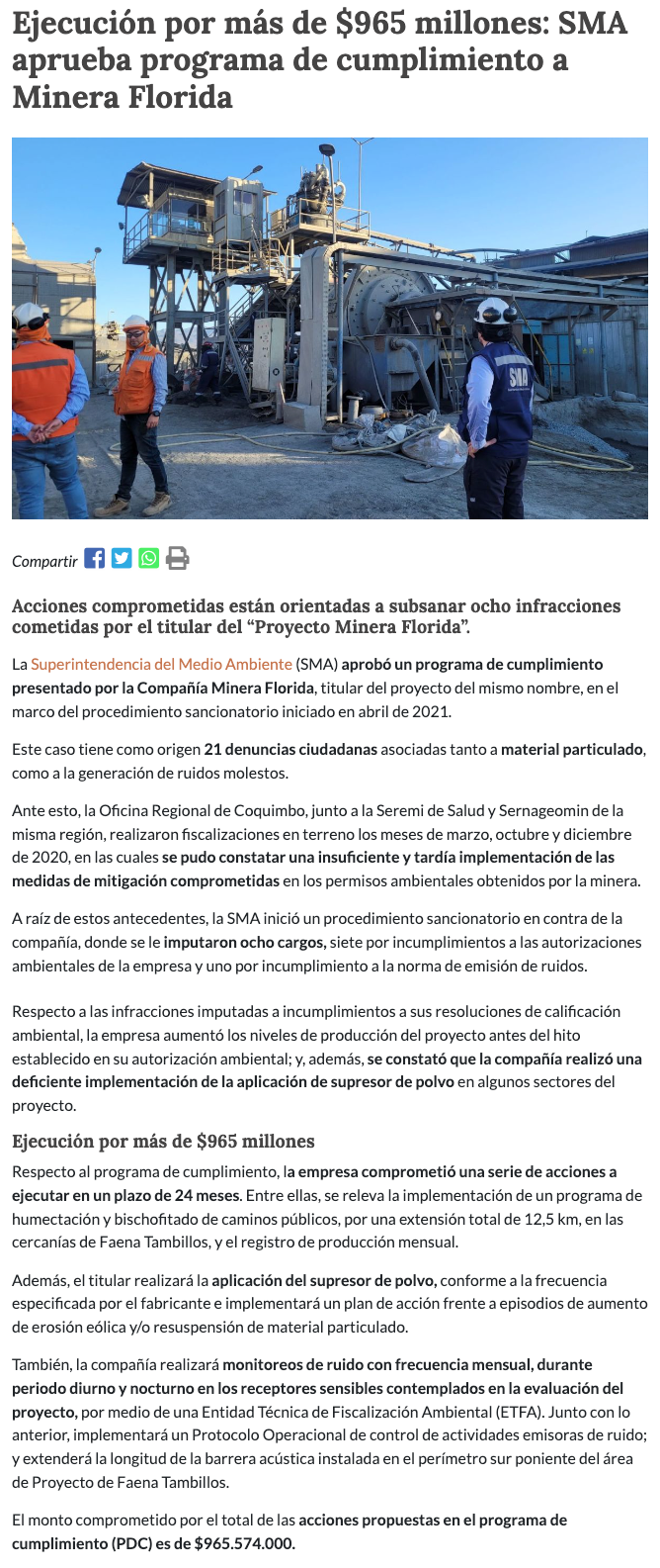 Aprueba programa de cumplimiento presentado por Compañía Minera Florida - (La Región)