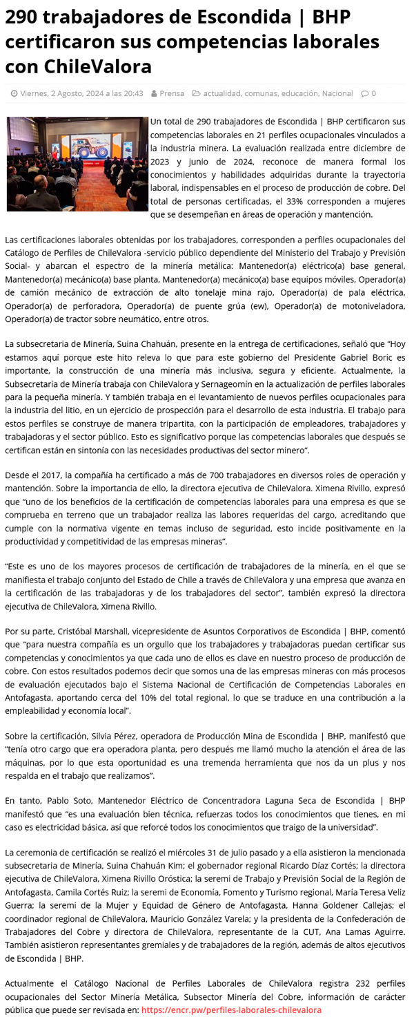 290 trabajadores de Escondida | BHP certificaron sus competencias laborales con ChileValora - (elhashtag.cl)