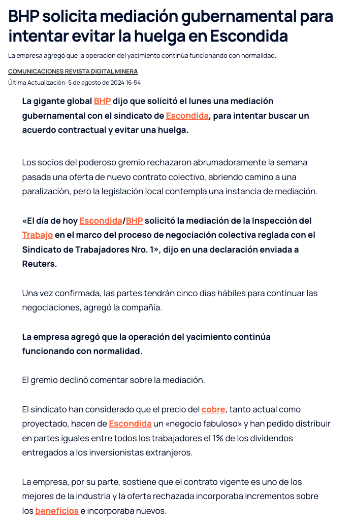 Escondida | BHP solicita mediación de la Inspección del Trabajo tras negociación con Sindicato de Trabajadores Nro. 1 - (mch.cl)