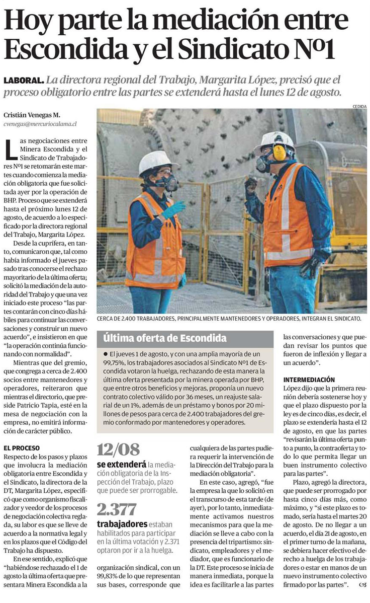 Hoy parte la mediación entre Escondida y el Sindicato Nº1 - (El Mercurio de Antofagasta)