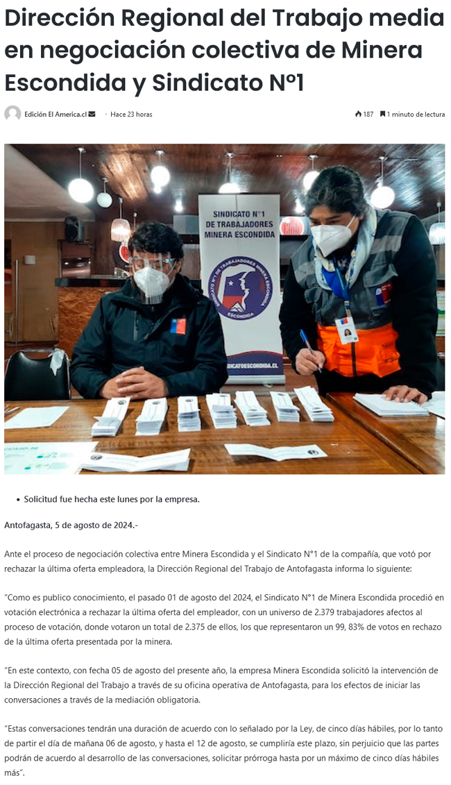 Dirección Regional del Trabajo mediará en negociación colectiva de Minera Escondida y Sindicato N°1 - (elregionalista)
