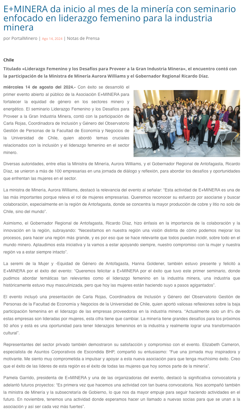 E+MINERA da inicio al mes de la minería con seminario enfocado en liderazgo femenino para la industria minera - (norteyenegia.cl)