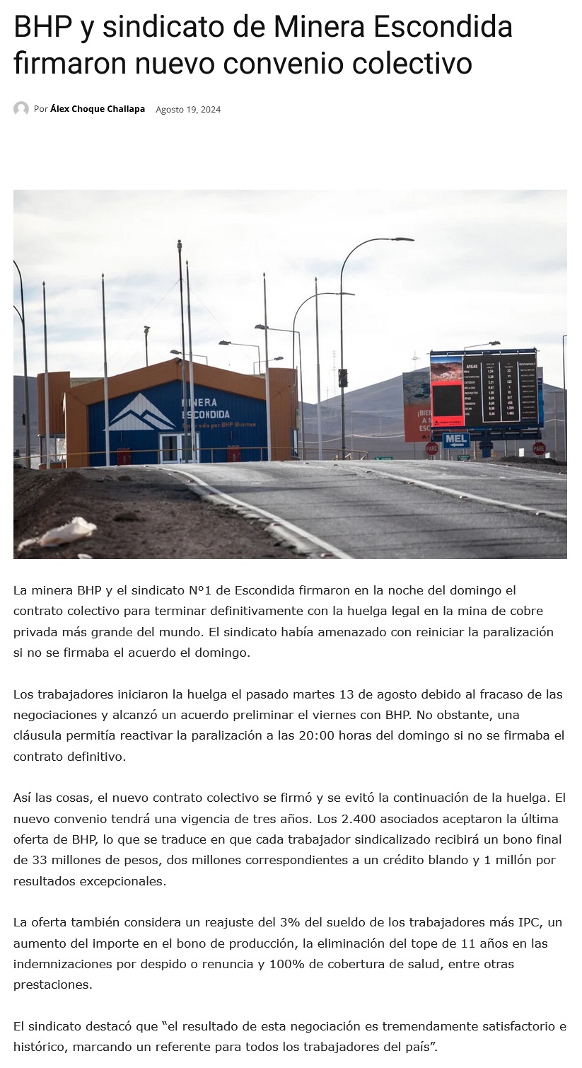 Sindicato N°1 y Escondida BHP firman contrato colectivo por 36 meses - (elquellonino.cl)