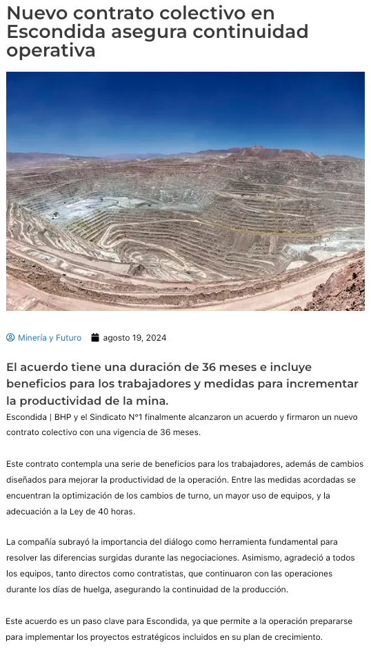 Informe Semanal: Huelgas en Escondida y Caserones impulsan leve alza en el precio del cobre - (mineriayfuturo.cl)