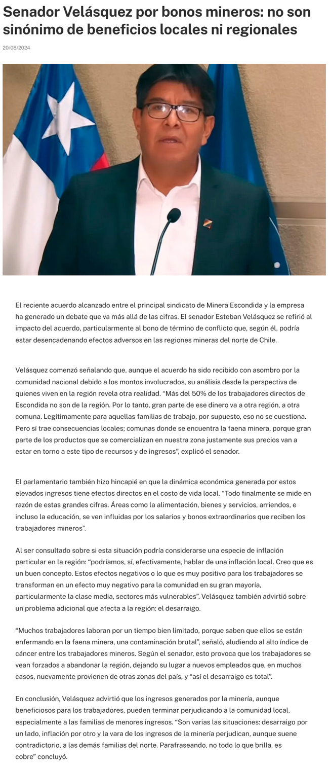 Senador Velásquez por bonos mineros: no son sinónimo de beneficios locales ni regionales - (portalindigena.cl)