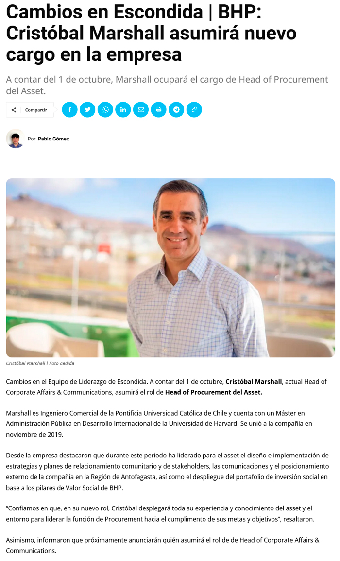Cambios en Escondida |BHP: Cristóbal Marshall deja vicepresidencia de Asuntos Corporativos - (soyantofagasta)