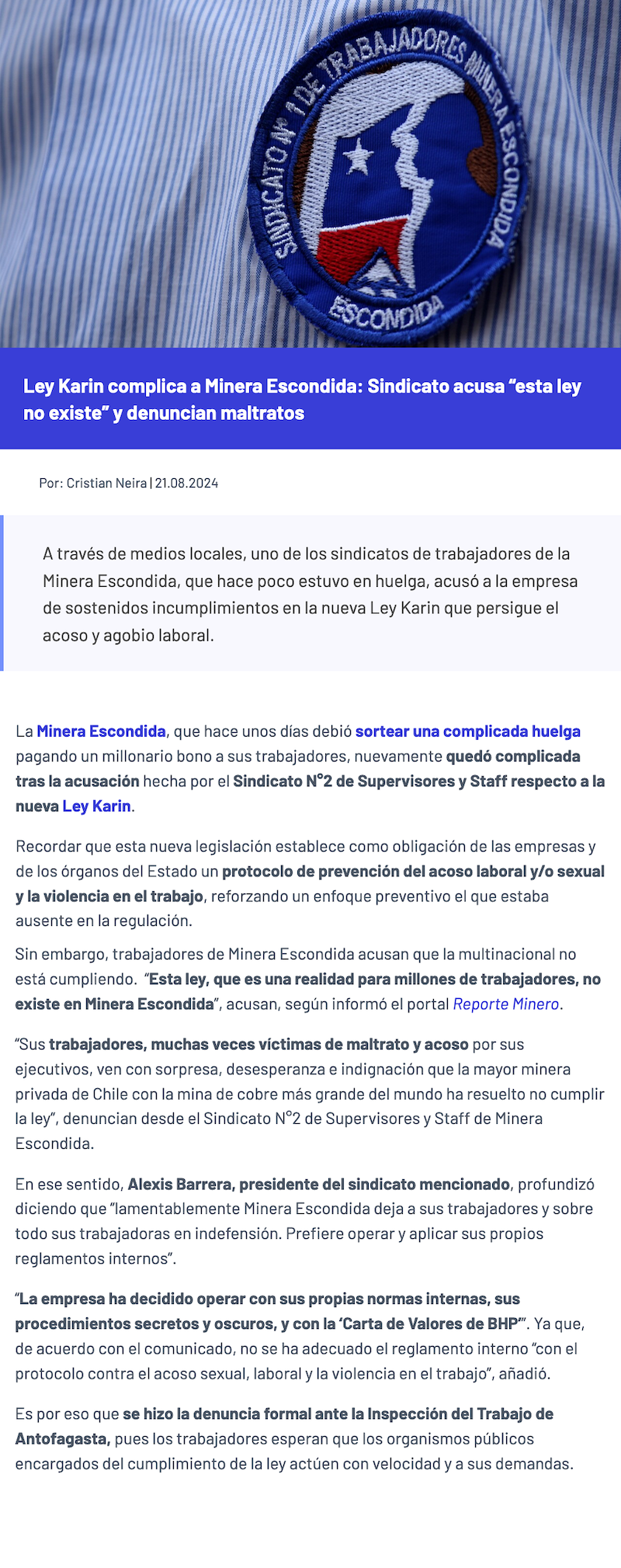 ¡Escándalo en Minera Escondida! BHP Incumple Ley Karin y Pone en Riesgo a sus Trabajadores - (reportediario.cl)