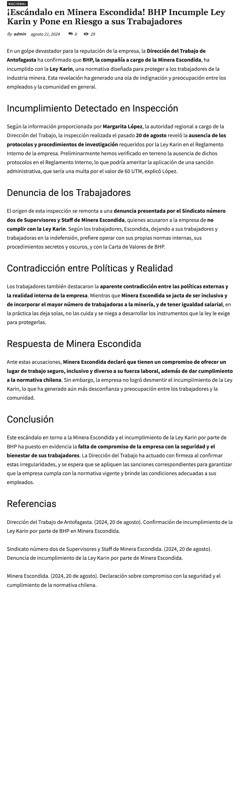 Dirección del Trabajo confirma incumplimiento de la Ley Karin por parte de BHP en Minera Escondida - (biobiochile online)