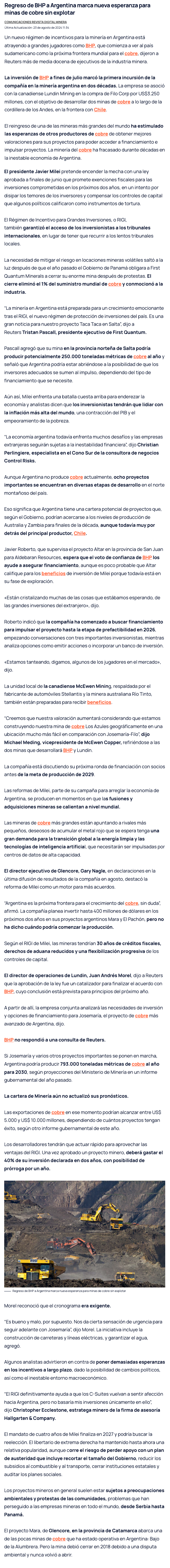 Regreso de BHP a Argentina podría ser la punta de lanza para más proyectos de cobre sin explotar - (americaeconomia online)