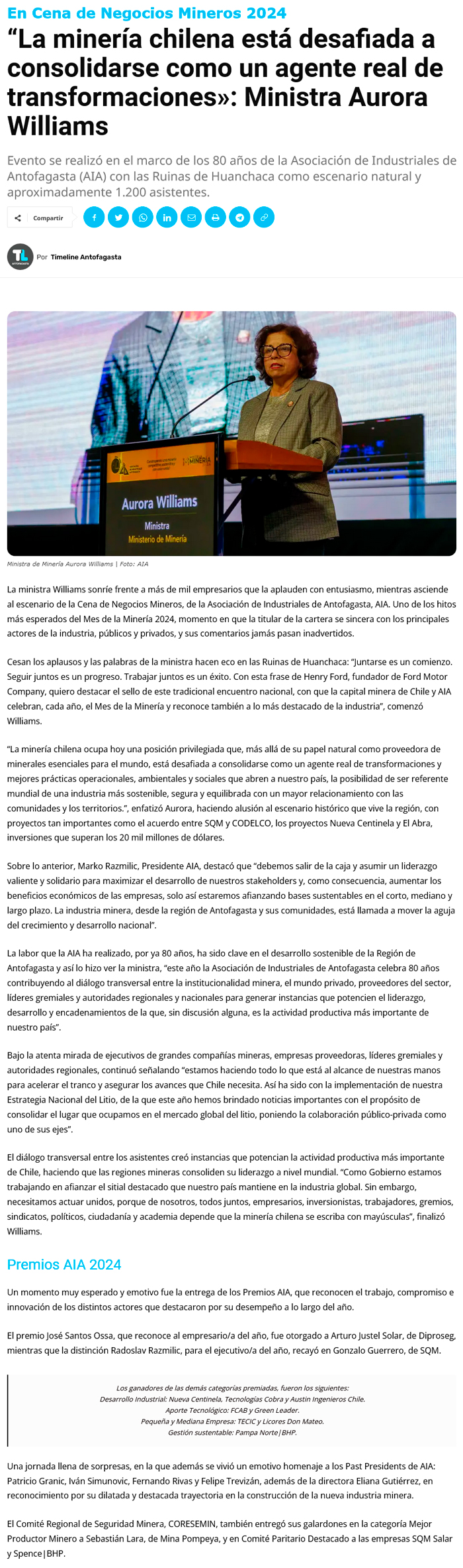 Aurora Wiliams en Cena de Negocios Mineros 2024: “La Minería Chilena está desafiada a consolidarse como un agente real de transformaciones” - (antofapop.cl)
