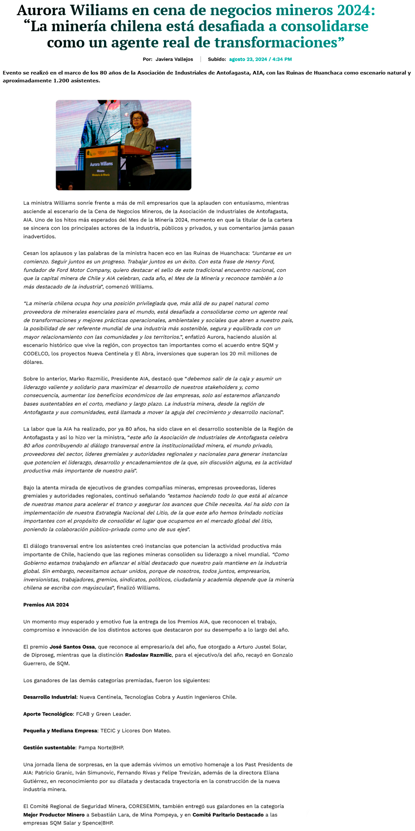 Aurora Wiliams en Cena de Negocios Mineros 2024: “La Minería Chilena está desafiada a consolidarse como un agente real de transformaciones” - (antofapop.cl)