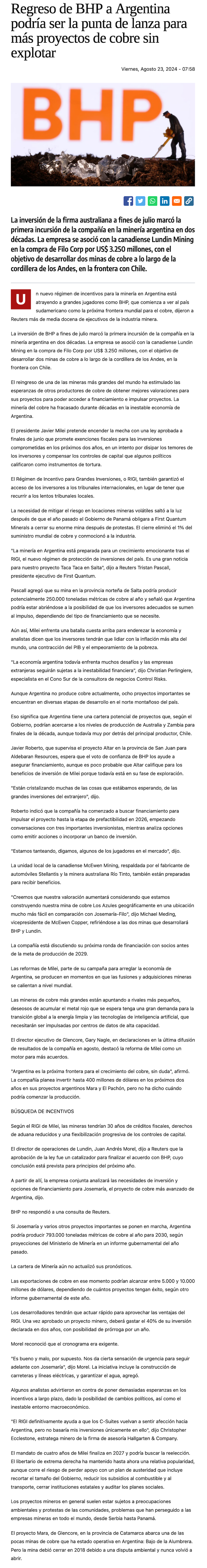Regreso de BHP a Argentina marca nueva esperanza para minas de cobre sin explotar - (redimin)