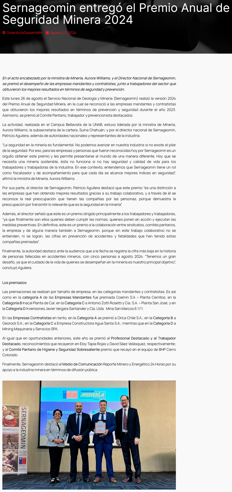 Sernageomin entregó el Premio Anual de Seguridad Minera 2024 - (diarioangamos)