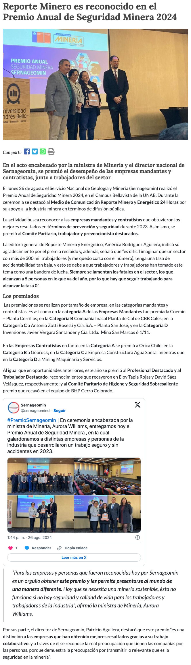 Sernageomin entregó el Premio Anual de Seguridad Minera 2024 - (desiertofm.cl)