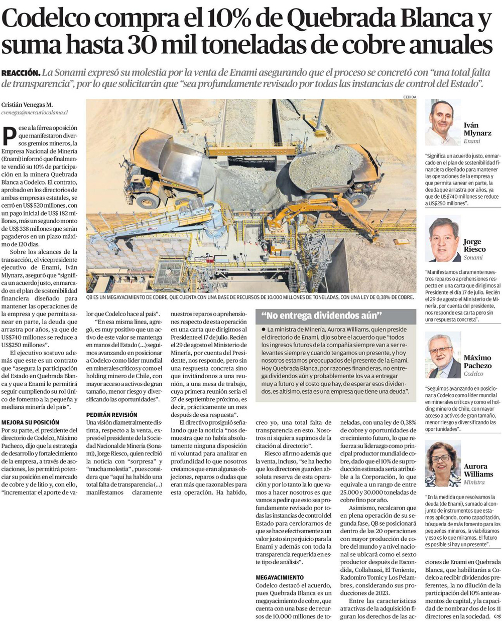 Codelco compra el 10% de Quebrada Blanca y suma hasta 30 mil toneladas de cobre anuales - (El Mercurio de Calama)