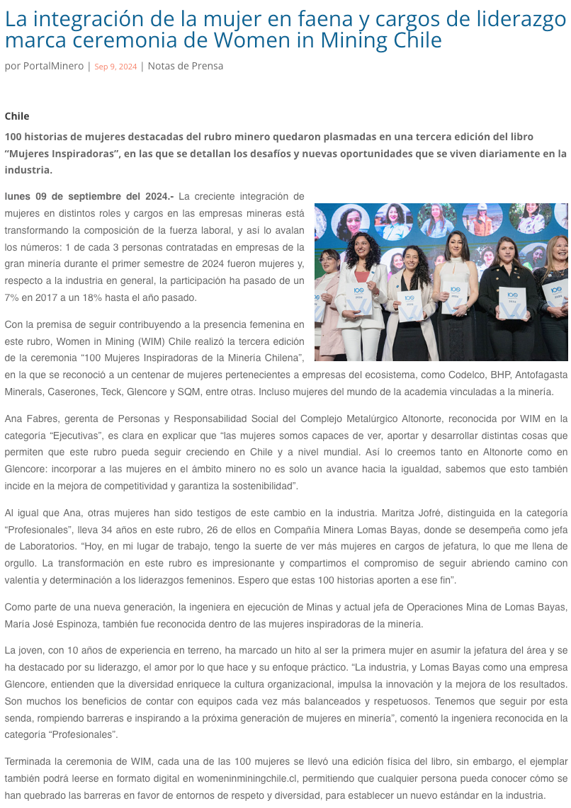 La integración de la mujer en faena y cargos de liderazgo marca ceremonia de Women in Mining Chile - (portalinnova.cl)