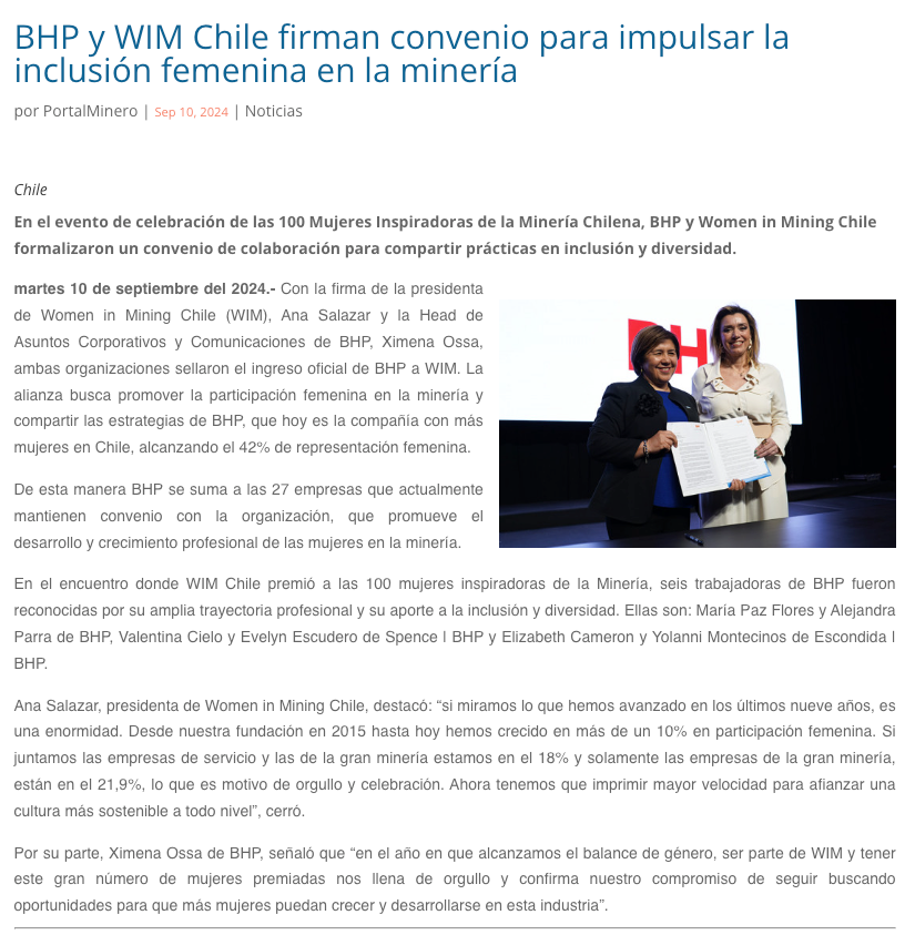 BHP y WIM Chile firman convenio para promover la inclusión femenina en la minería - (rumbominero.com (Perú))