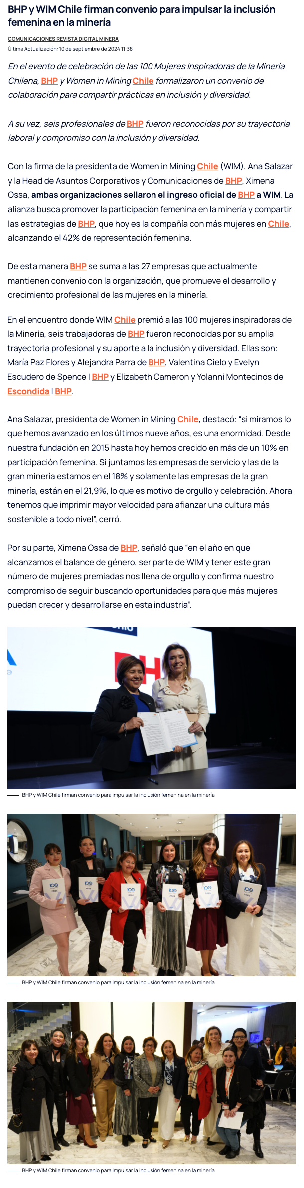 BHP y WIM Chile firman convenio para promover la inclusión femenina en la minería - (rumbominero.com (Perú))