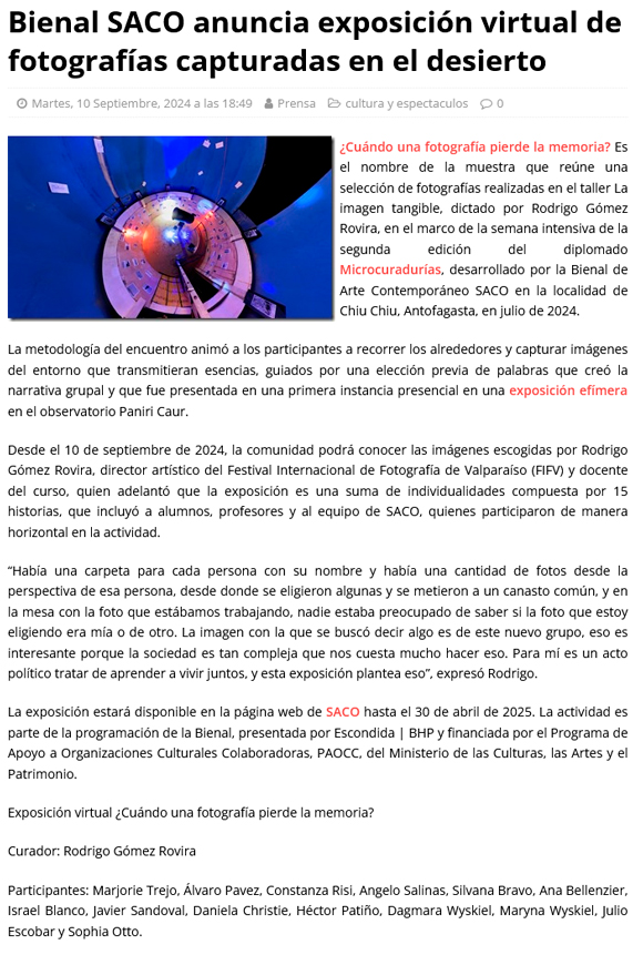 Bienal SACO anuncia exposición virtual de fotografías capturadas en el desierto - (regionesnoticias.cl)
