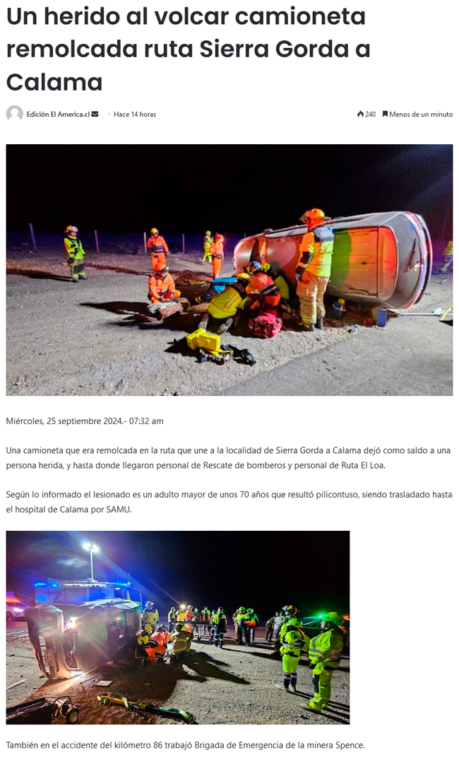 Volcamiento de Vehículo en Ruta Sierra Gorda-Calama Deja a un Hombre Lesionado - (diariosol.cl)