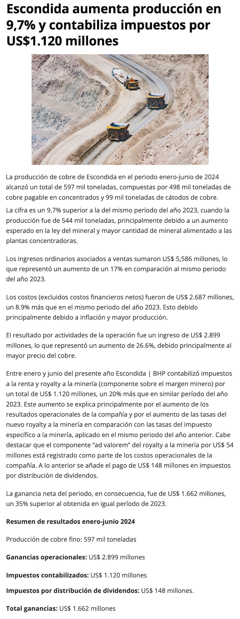 Alza de 20% por royalty: Escondida pagó impuestos por US$1.120 millones el primer semestre de 2024 - (soyantofagasta)