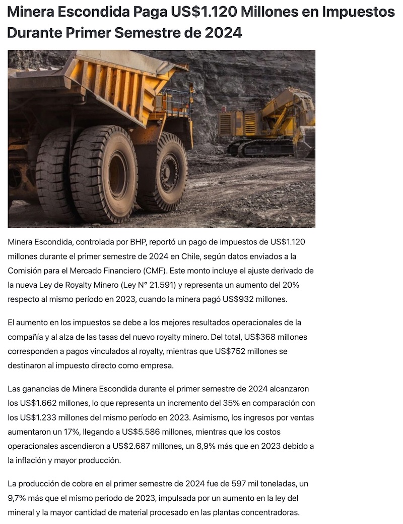 Alza de 20% por royalty: Escondida pagó impuestos por US$1.120 millones el primer semestre de 2024 - (soyantofagasta)