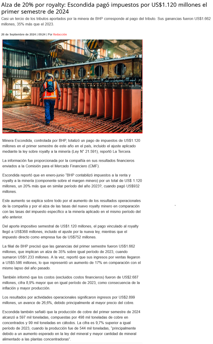 Minera Escondida paga US$1.120 Millones en Impuestos Durante Primer Semestre de 2024 - (Maray Online)