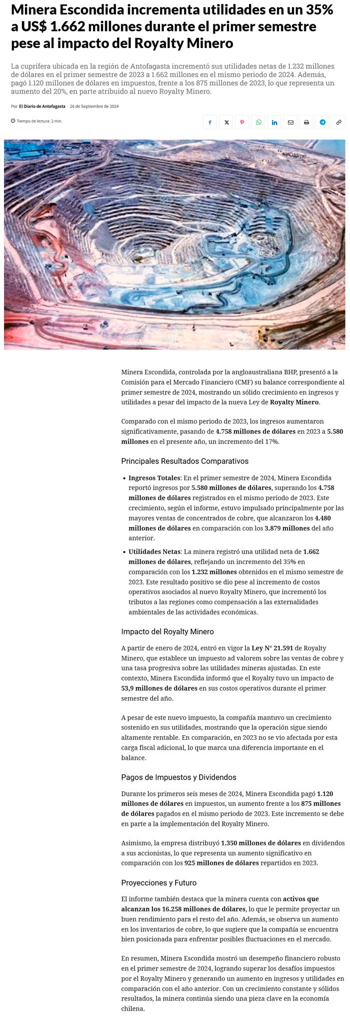 Alza de 20% por royalty: Escondida pagó impuestos por US$1.120 millones el primer semestre de 2024 - (soyantofagasta)