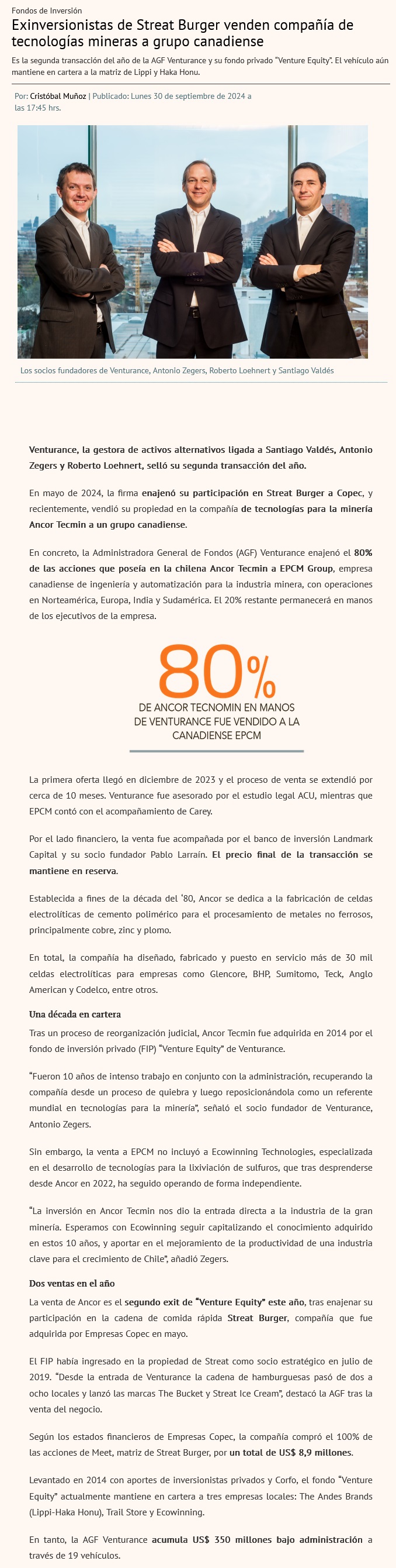 Exinversionistas de Streat Burger venden compañía de tecnologías mineras a grupo canadiense - (Diario Financiero)