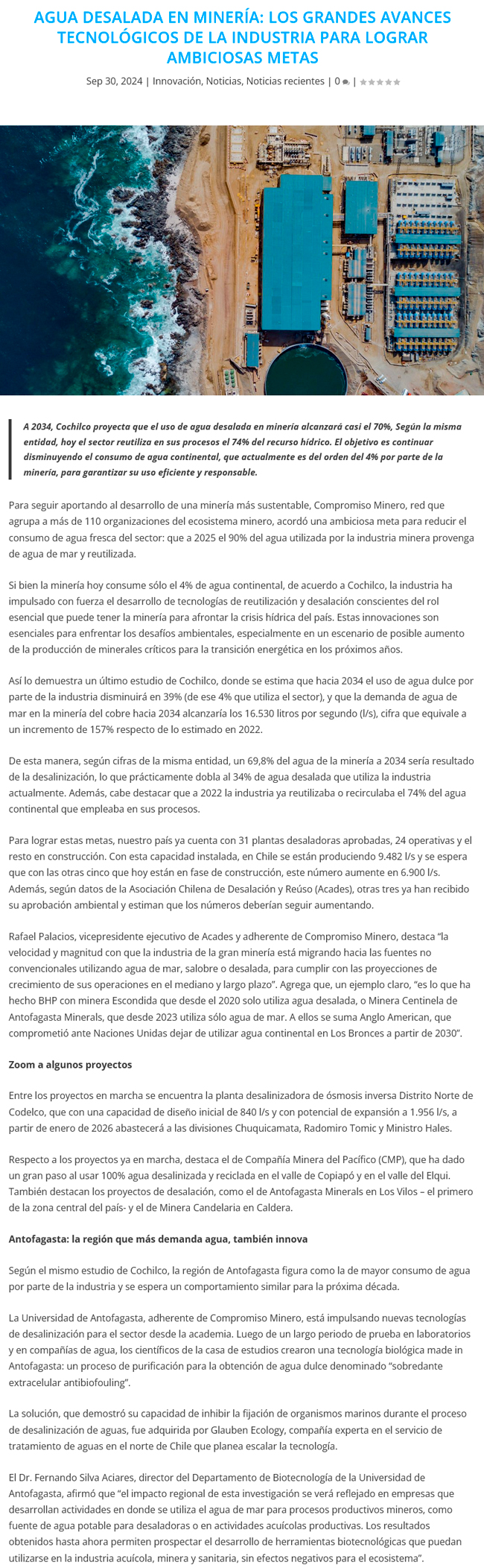 Minería proyecta que el 70% del agua utilizada será desalada para 2034 - (mineriayfuturo.cl)