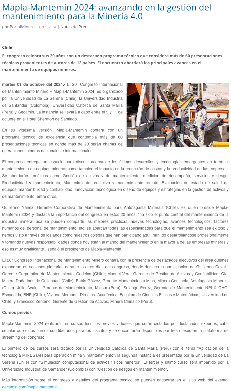 Mapla-Mantemin 2024: avanzando en la gestión del mantenimiento para la minería 4.0 - (reporteminero)