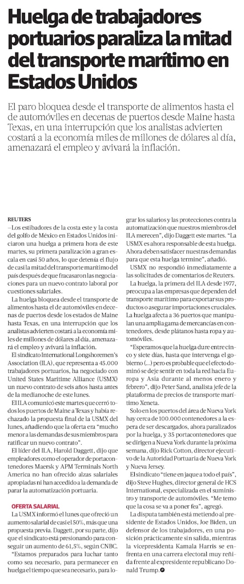 Partió huelga de puertos de costa este de EEUU: el 75% de los envíos chilenos al país norteamericano entra por esa zona - (Diario Financiero)