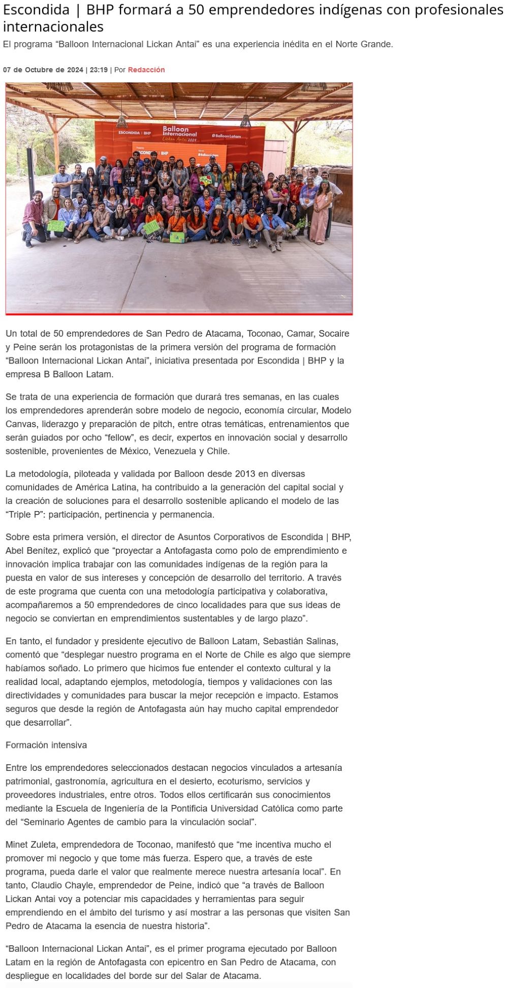 Escondida | BHP formará a más de 50 emprendedores indígenas con profesionales internacionales - (El Mercurio de Antofagasta)