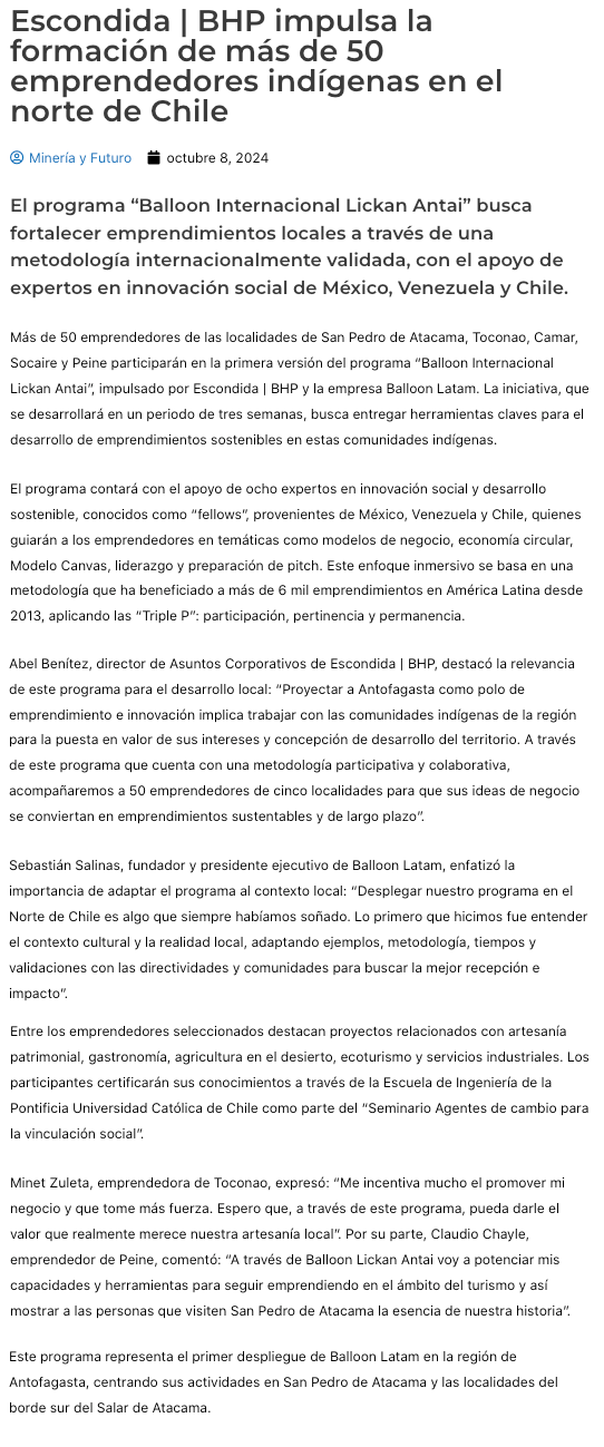 Escondida | BHP formará a más de 50 emprendedores indígenas con profesionales internacionales - (antofapop.cl)