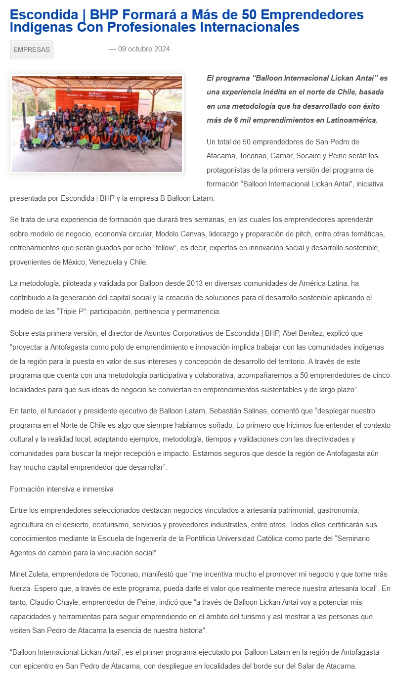 Escondida | BHP formará a más de 50 emprendedores indígenas con profesionales internacionales - (antofapop.cl)