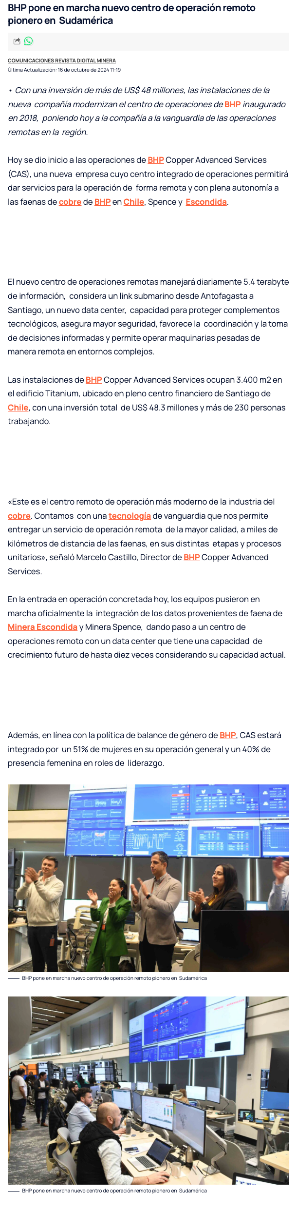Prestará servicios remotos para la operación autónoma de Minera Escondida y Spence: BHP pone en marcha nuevo centro de operación remoto pionero en Sudamérica - (mvcomunicaciones.cl)