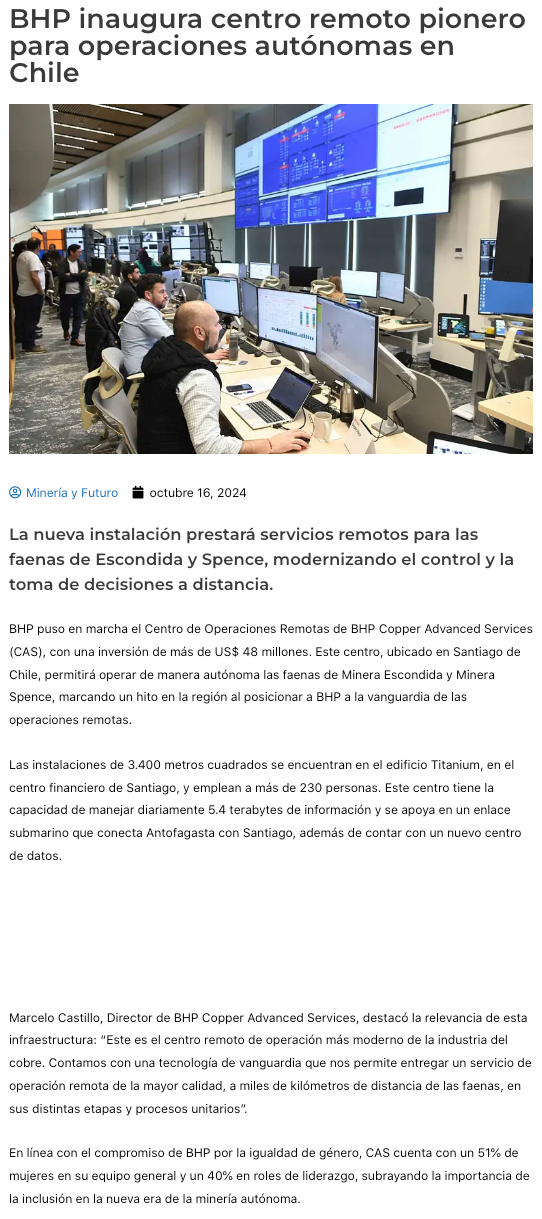 Prestará servicios remotos para la operación autónoma de Minera Escondida y Spence: BHP pone en marcha nuevo centro de operación remoto pionero en Sudamérica - (mvcomunicaciones.cl)