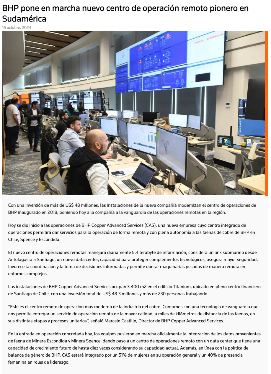 Prestará servicios remotos para la operación autónoma de Minera Escondida y Spence: BHP pone en marcha nuevo centro de operación remoto pionero en Sudamérica - (mvcomunicaciones.cl)