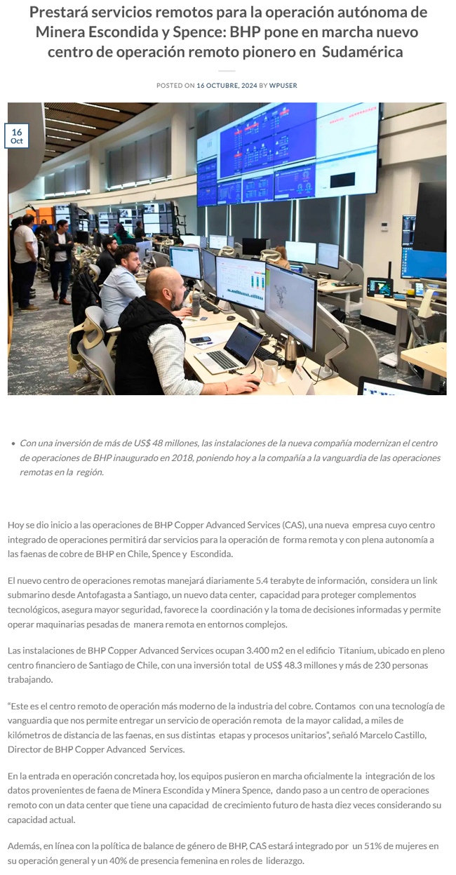 BHP inaugura centro remoto pionero para operaciones autónomas en Chile - (mineriayfuturo.cl)