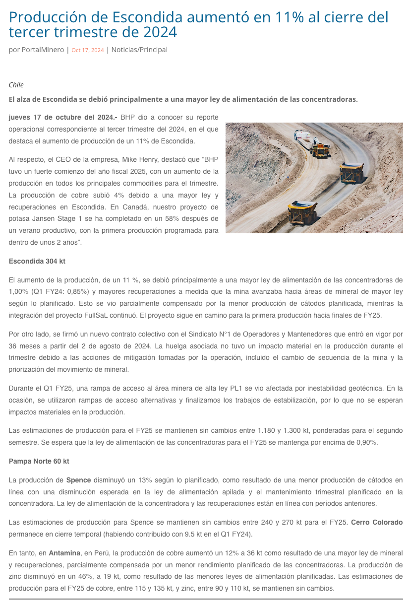 BHP inicia el año fiscal 2025 con un aumento del 4% en la producción de cobre - (mineriayfuturo.cl)